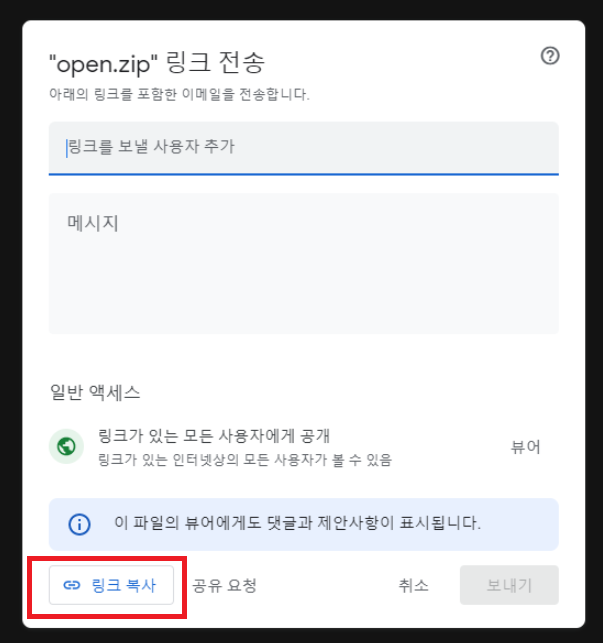 그러면 이렇게 공유 페이지가 뜨는데 링크 복사를 눌러서 링크를 획득합니다.