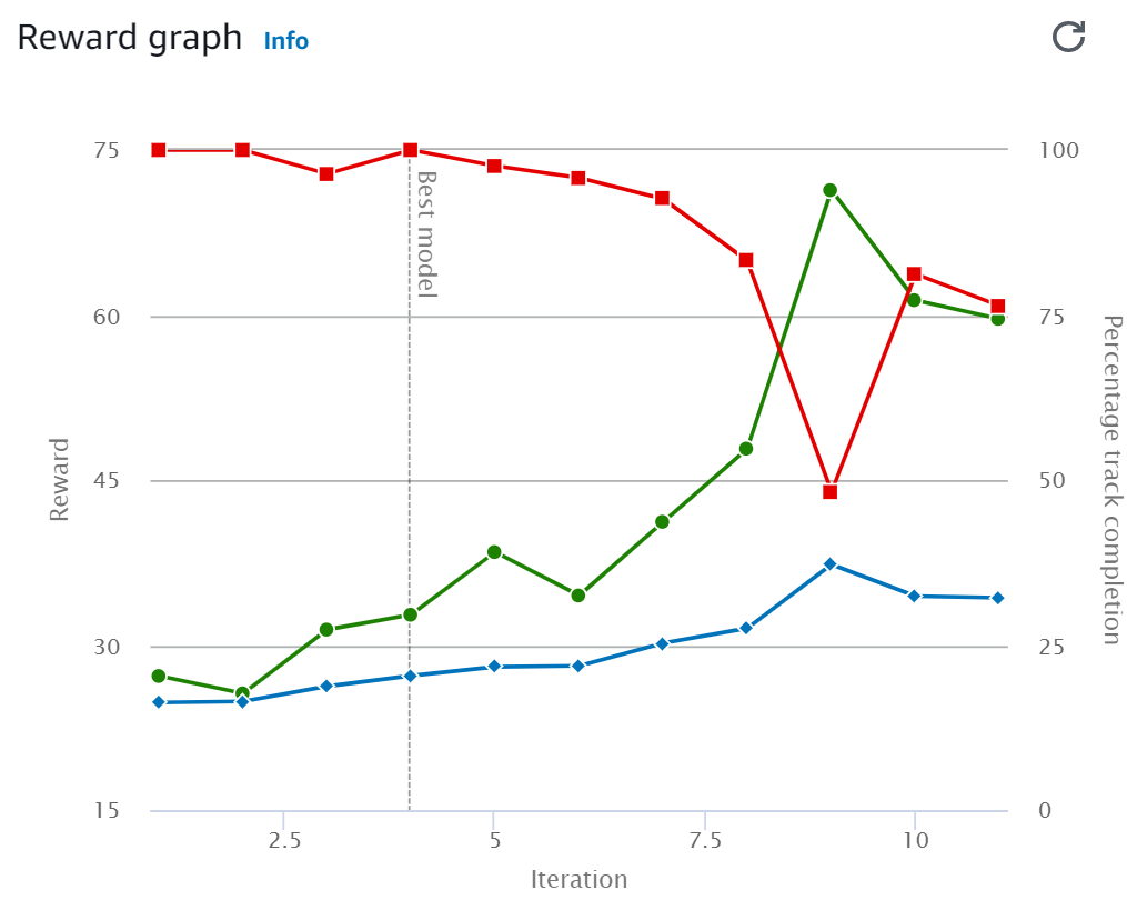 basic모델의 경우 15분 정도에 완주율 100을 찍었는데, reward가 낮은 것으로 보아 역주행한 것 같다.