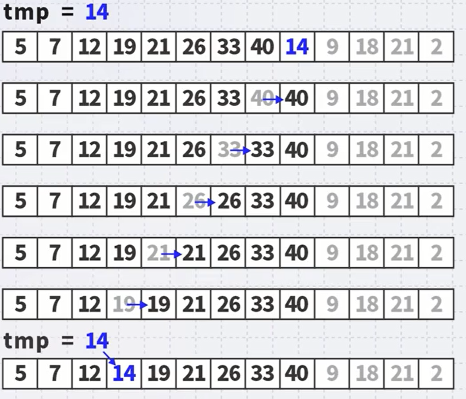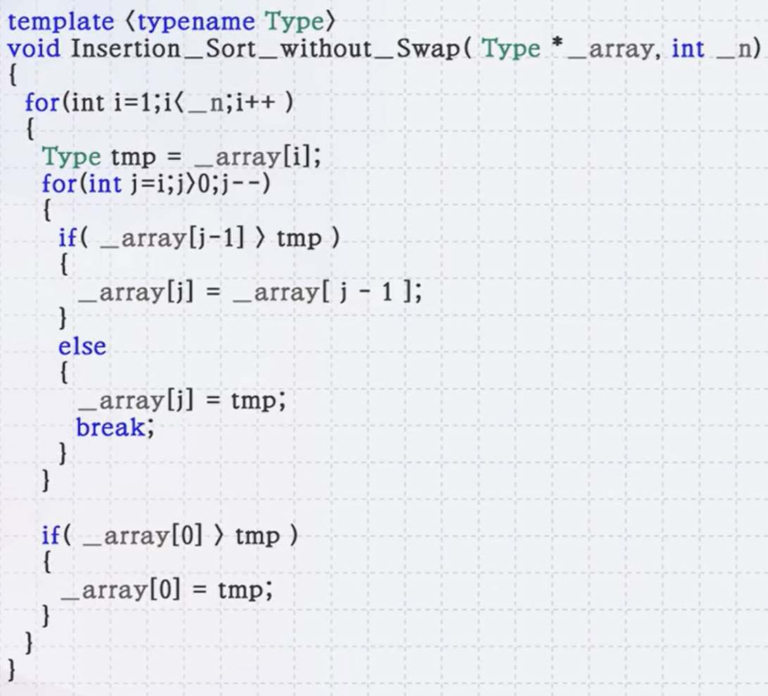 두번째는 보다 효율적으로 변수를 사용하여 shift시키다가 적절한 위치에 insertion하는 것이다.